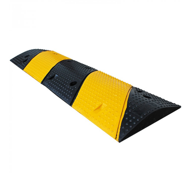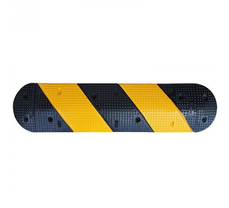 Materiales: fabricado con caucho SBR (Styrene- Butadiene Rubber), elastómero sintético obtenido de la polimerización de estireno y butadieno. Resiste hasta 20 toneladas, ideal para calles con paso de vehículos estándar. Posee franjas amarillas que facilita a los conductores su visualización. Su superficie es con relieves para una mejor tracción de los vehículos que la utilicen.